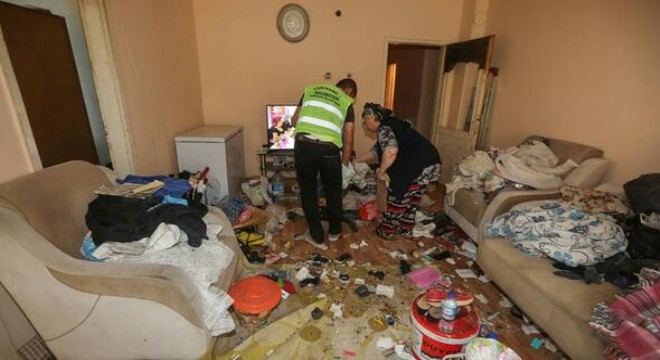 Temizlik ekiplerinin ikinci durağı ise aynı caddedeki 73 numaralı binadaki bir daire oldu. Ekipler, yıllardır aynı binada iki oğluyla birlikte yaşayan 60 yaşlarındaki Nuran Ş.’nin evinden bir yıl önce de 3 kamyon çöp boşalttıklarını ancak kısa süre içerisinde bina sakinlerinden tekrar şikayet almaya başladıklarını söyledi. İhbarı değerlendiren ekipler, bir yıl sonra gördükleri manzara karşısında hayrete düştü. Aynı evde ikinci kez çalışma yapan ekipler evden 6 saate yakın süren çalışma sonunda 15 tonun üzerinde çöp çıkarttı.